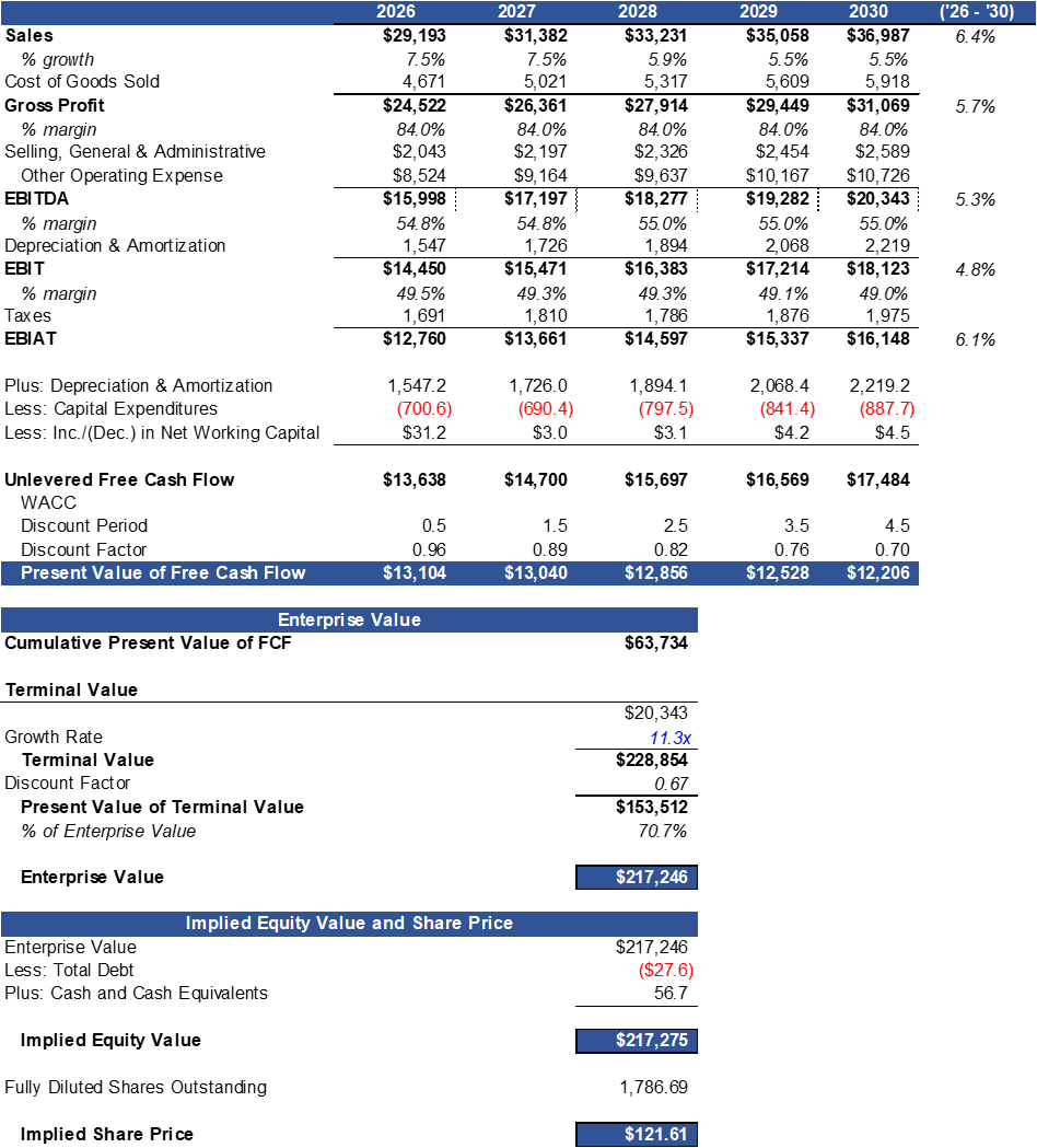 We added the total cash and total debt to that value to derive the total equity value of the firm, which, divided by the total shares outstanding, renders a $83.12 estimate of the intrinsic value for the share, as a representation of its current earning power.